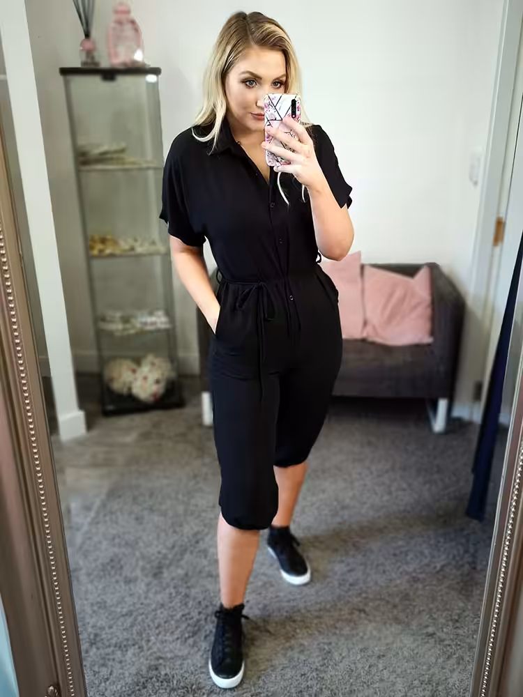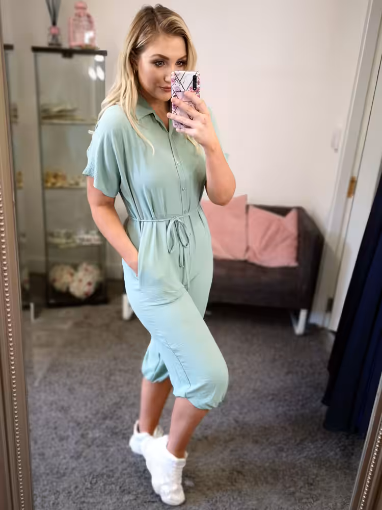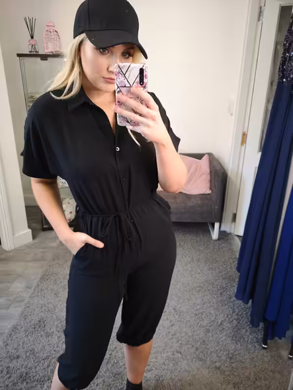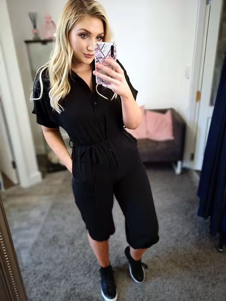 Please not there is a cuff on the end of the jumpsuit that needs to be tucked up like the picture above