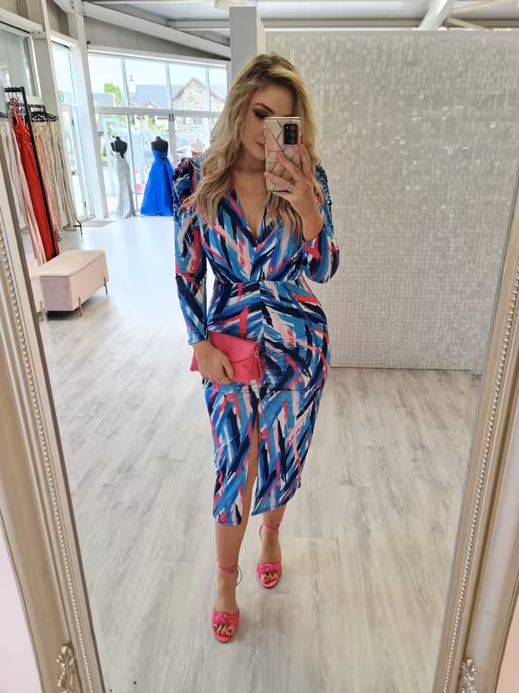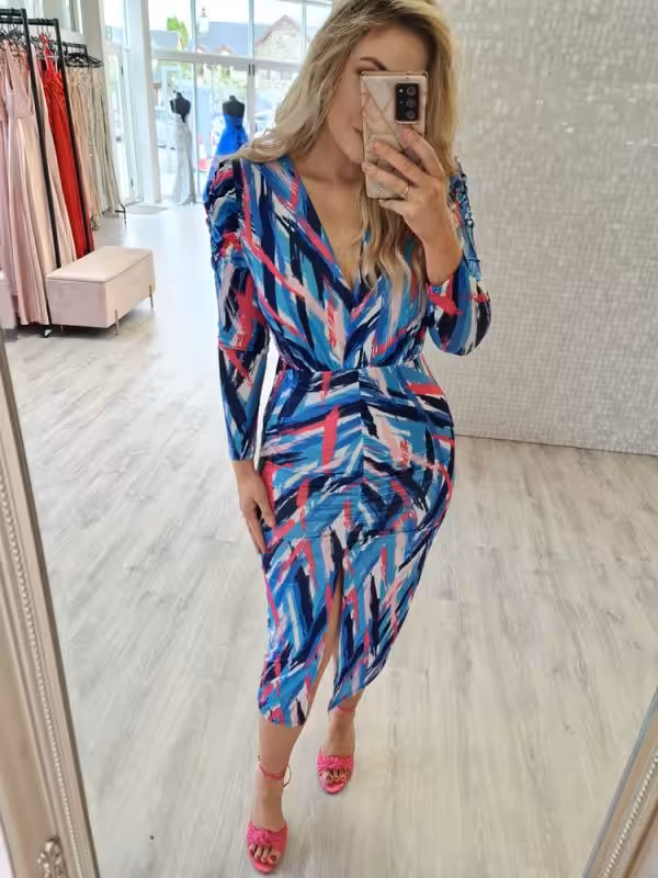 Lucy Long Puff Sleeve Split Leg Midi Dress Blue