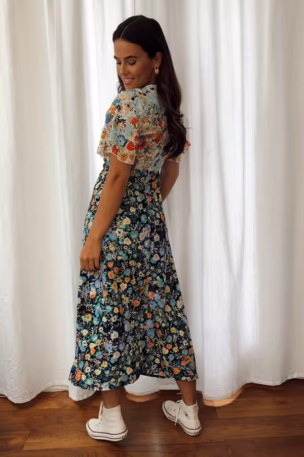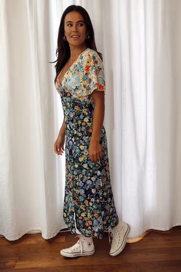 Levi Angel Sleeve Split Leg Midi Dress Navy White Mixed Print