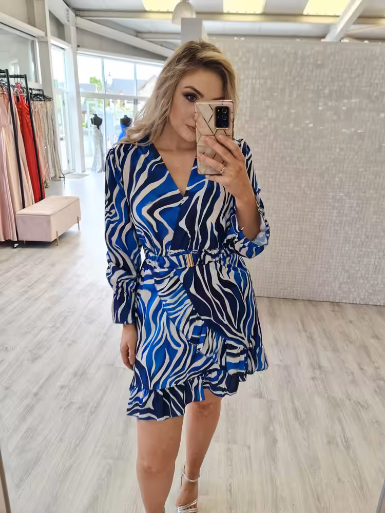 Levi Angel Sleeve Split Leg Midi Dress Navy White Mixed Print