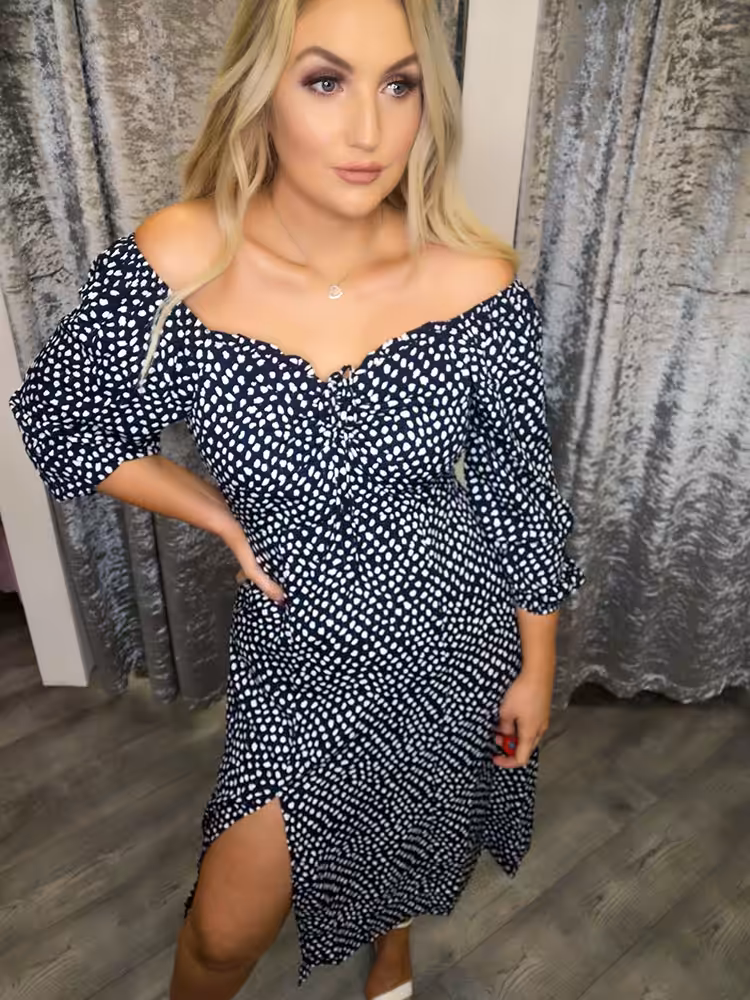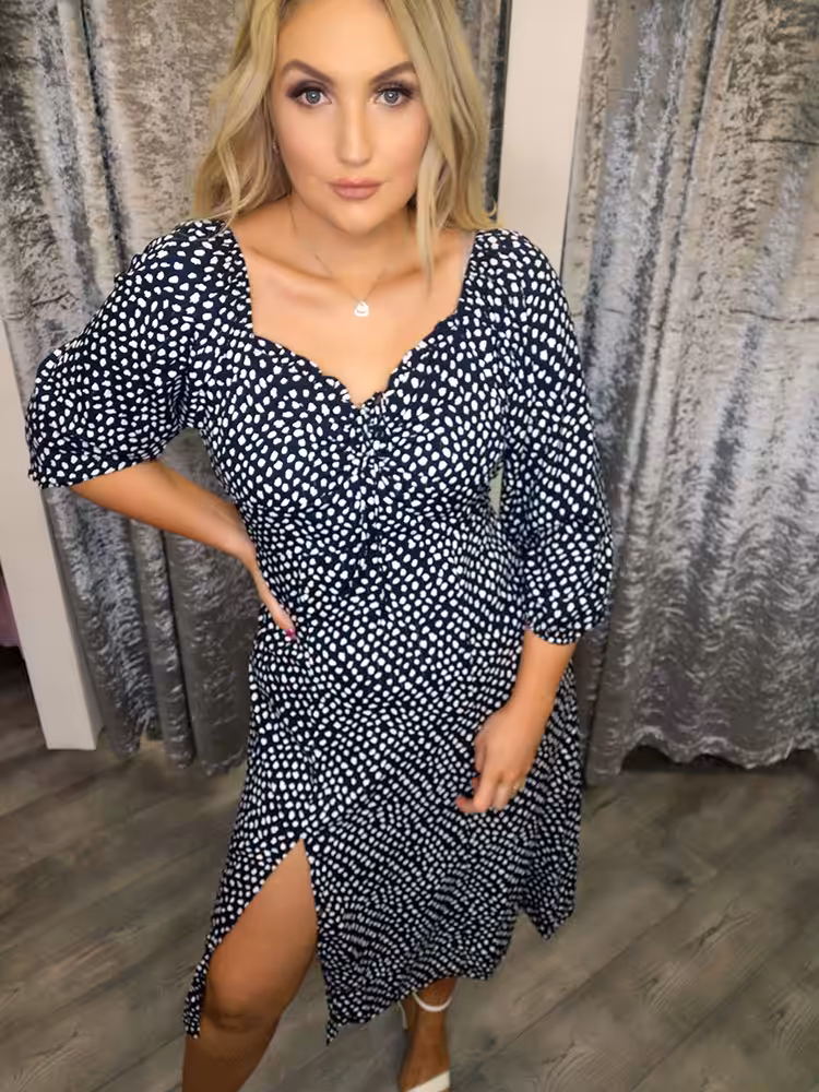 Our Shirley dress has a pull string in the middle of the chest so it can be worn as a square neck or pull the strings to create a sweetheart shape
